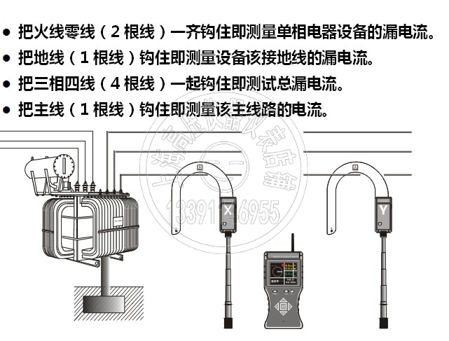 320B型的X探测器具有高低压电流、漏电流测试功能,电流测量范围为0~20000A,同时满足核相、电流、漏电流、相位、相序、验电测试;也可以用于高压线缆漏电巡查:将具有测试电流功能的X探测器钩在电缆上,沿线巡查,若接收器由有较大电流显示突变为很小电流或无电流显示,该点即为电缆漏电点。